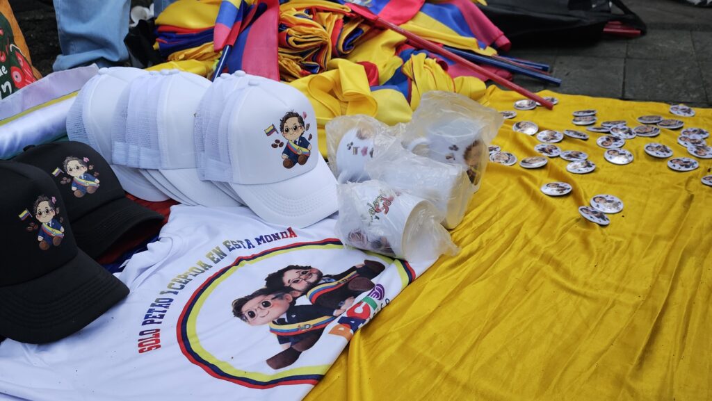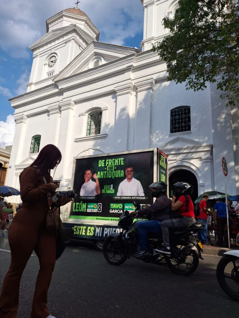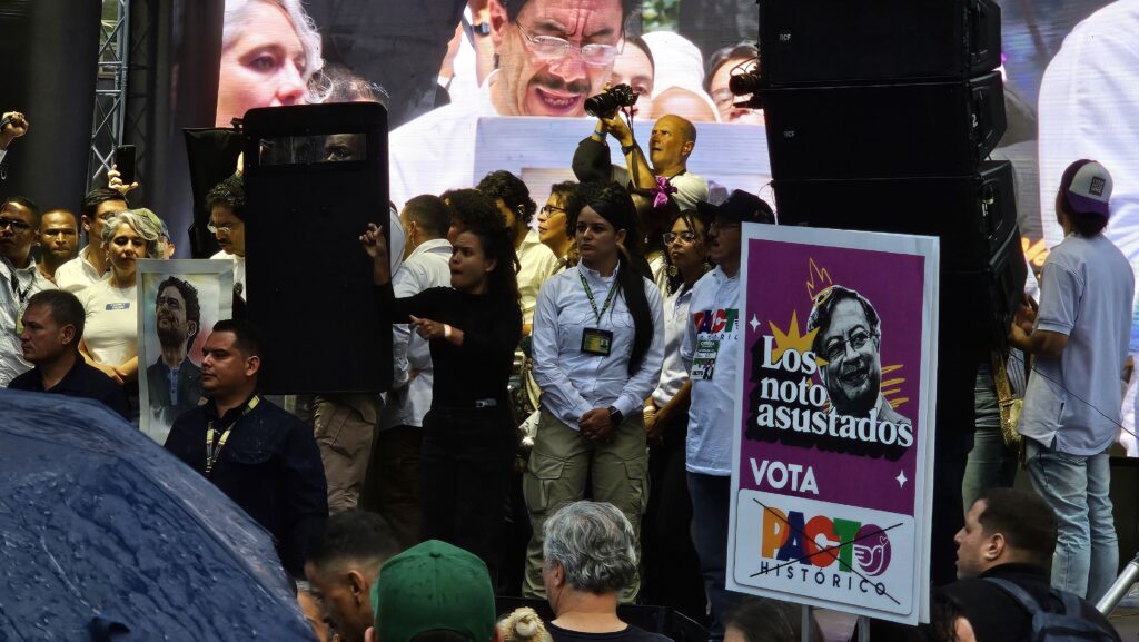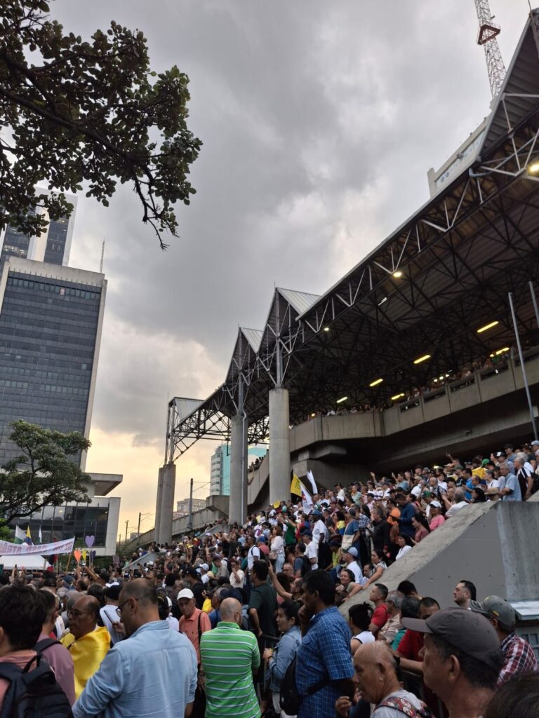 La plaza estaba rodeada de vallas para controlar el ingreso por un solo punto, frente a la basílica de La Candelaria, sobre la carrera Palacé. Las escaleras de la estación del metro, convertidas en tribuna preferencial, se llenaron mucho antes de las 4:00 p.m. mientras abajo, en la plaza, un grupo de gente uniformada con camisetas de la campaña de León Fredy Muñoz –senador que aspira a repetir curul por la Alianza Verde, y embajador en Nicaragua nombrado por Petro entre 2022 y 2025– repartía publicidad. Un carro valla de la misma campaña estuvo todo el rato estacionado frente a la iglesia.