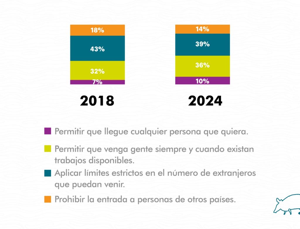 Los resultados de la Encuesta Mundial de Valores -EMV-, que ofrece datos para comprender cómo cambian los valores, creencias y normas sociales en las sociedades, coinciden con el monitoreo de El Barómetro. En los resultados de la edición más reciente, realizada en 2024, se encontró que “las actitudes frente a la migración son más moderadas que en la ola anterior (2018) y muestran mayor flexibilidad hacia permitir la llegada de migrantes y no aplicar tantos límites estrictos”.