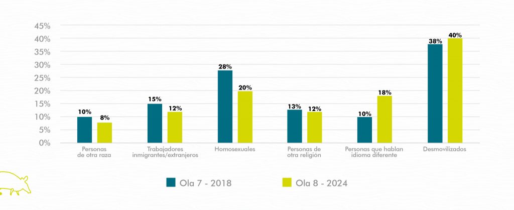 En relación con la diversidad, la Encuesta reportó una reducción del 28 % (2018) al 20 % (2024) entre quienes preferirían no tener vecinos homosexuales. Así mismo, el 85 % de las personas encuestadas dijo estar de acuerdo con que “las personas que se visten, actúan o se identifican como el sexo opuesto deben ser tratadas igual que cualquier otra persona”.