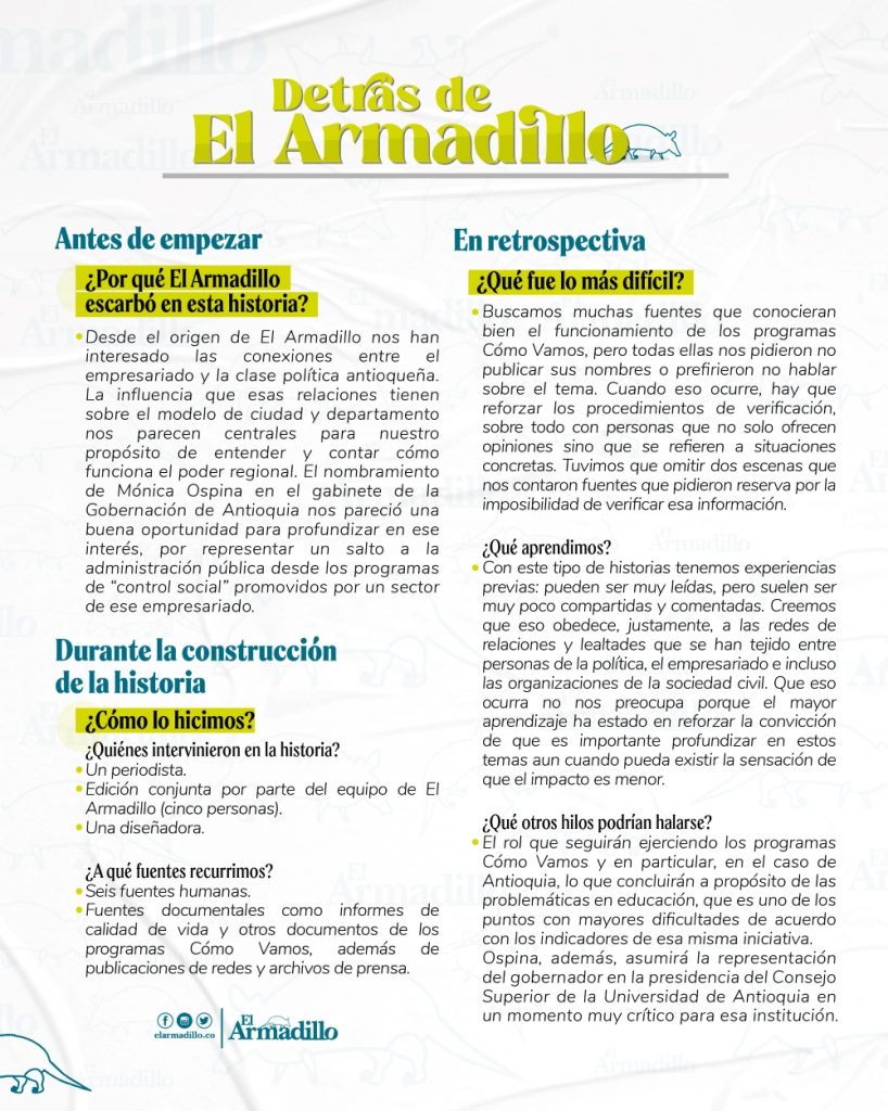 Aun con ese panorama, los programas Cómo Vamos dicen estar soportados en nueve principios entre los que están la objetividad, la imparcialidad y la autonomía. “Más allá de que el mensaje del programa siempre fue contar la realidad de Medellín a través de los datos y la evidencia, sí sentí que con la dirección de Mónica Ospina y también por instrucción de las cabezas de Proantioquia, la iniciativa hacía uso de los datos para imponer una narrativa de la ciudad: sea negativa o de caos en la administración de Quintero, o de recuperación en la segunda administración de Federico Gutiérrez”, nos dijo otra persona que trabajó en esa organización.