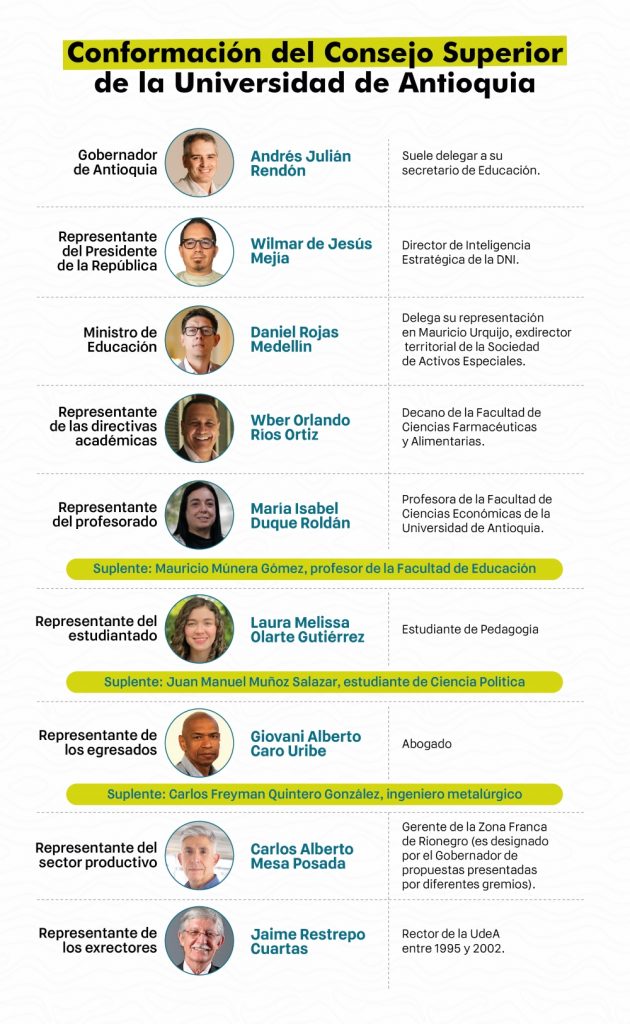 Sin embargo, en el cruce entre la política universitaria y la política “a secas” hay varios elementos adicionales. Por ejemplo, la manera como están distribuidas las fuerzas en el CSU expone también un juego de estrategia. Si bien la decisión de sacar a Arboleda no pasó por ese órgano directivo, de acuerdo con numerosas fuentes que consultamos, cinco de sus nueve integrantes participaron con mayor o menor influencia en discusiones sobre el posible reemplazo del rector. Además del designado del presidente de la República —el director de Inteligencia estratégica de la DNI mencionado en el escándalo de los archivos de Calarcá— y del representante del Ministerio de Educación, ese bloque lo conformaban la representación estudiantil, la profesoral y la de egresados.