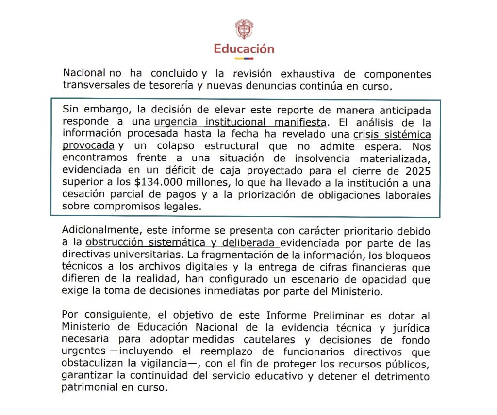 Además, y ahí está quizá el elemento central, que el objetivo de enviar ese informe preliminar “es dotar al Ministerio de Educación Nacional de la evidencia técnica y jurídica necesaria para adoptar medidas cautelares y decisiones de fondo urgentes —incluyendo el reemplazo de funcionarios directivos que obstaculizan la vigilancia—, con el fin de proteger los recursos públicos, garantizar la continuidad del servicio educativo y detener el detrimento patrimonial en curso”.