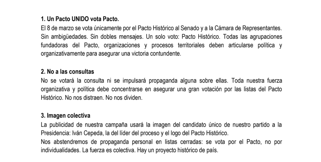 Fragmento de la circular del Pacto Histórico que ordena concentrar la campaña en la «imagen colectiva».