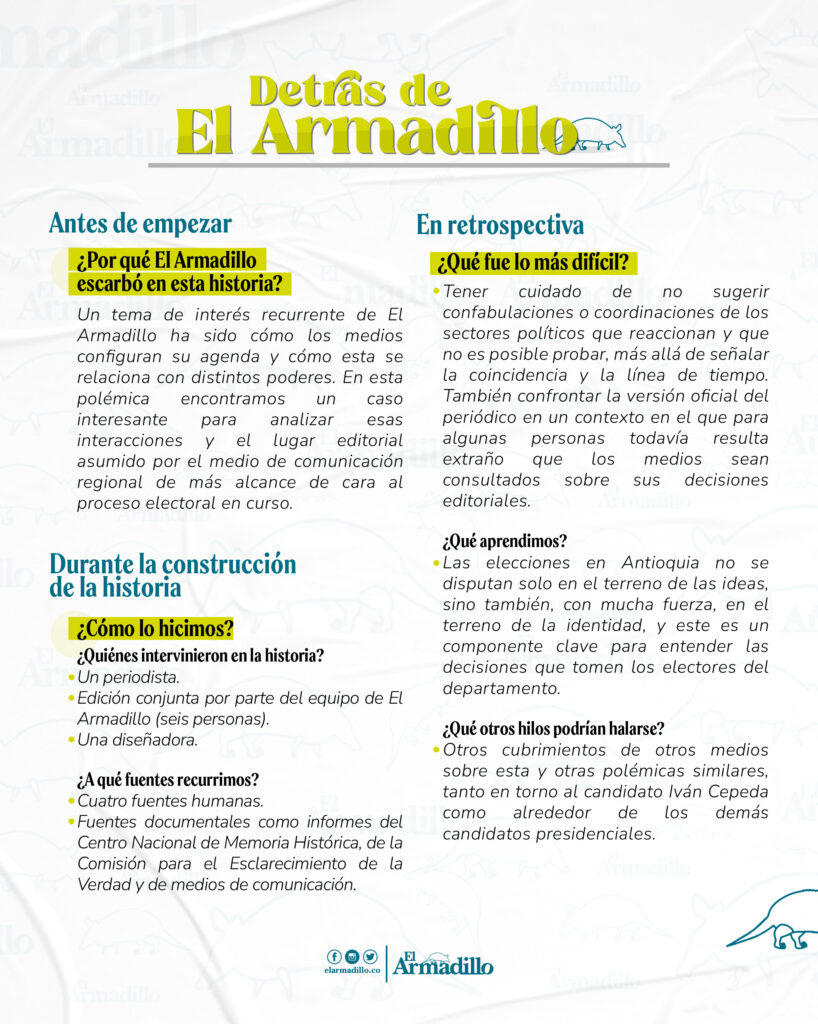 Después de la reacción de Luz María Sierra el sábado, el periódico que dirige publicó cuatro artículos de seguimiento a lo publicado por la campaña por Cepeda. El primero es del mismo día y se titula Iván Cepeda desata la indignación: afirma que Antioquia es la “cuna de la parapolítica y del terrorismo de Estado”. No lo firma ningún periodista y está acompañado con una imagen del candidato en actitud pugnaz. En la nota dice que Cepeda “hizo este sábado” la afirmación sobre Antioquia, pese a que había pasado más de un mes desde su discurso. Luego citó dos reacciones en contra: la de Proantioquia y la de Juan Espinal, senador electo y actual representante a la Cámara por el Centro Democrático.