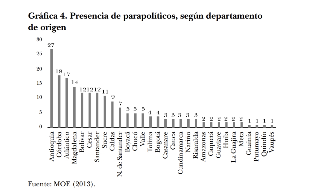 No obstante, esa relación entre poderes políticos locales y regionales también está documentada en varias regiones y departamentos distintos a Antioquia. Por eso no se sostiene la idea de que haya una “cuna” exclusiva y específica para esa alianza. Lo que sí soportan las investigaciones y los datos del mismo informe del CNMH, que cita a la Misión de Observación Electoral, es que Antioquia era para 2013 el departamento de origen de más políticos investigados por vínculos con el paramilitarismo.
